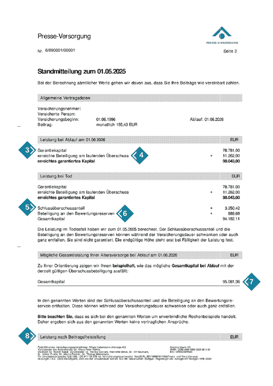 Die Grafik zeigt vereinfacht am Beispiel einer klassischen Kapitallebensversicherung wie sich die Ablaufleistung über die Vertragslaufzeit entwickelt und welche Bestandteile dabei eine Rolle spielen.
