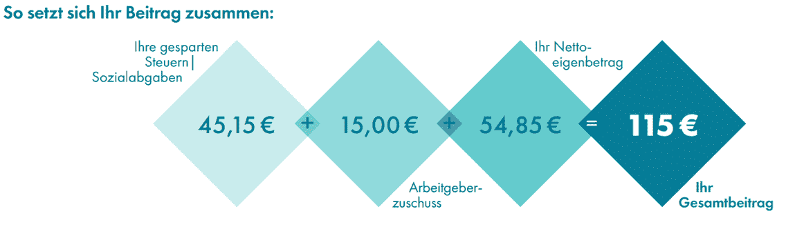 Mit nur ca. 50 € Eigenanteil erhalten Sie 115 € in Ihre betriebliche Altersvorsorge. Eine Beispielrechnung, wie sich der Staat am Aufbau Ihrer betrieblichen Altersversorgung beteiligt.